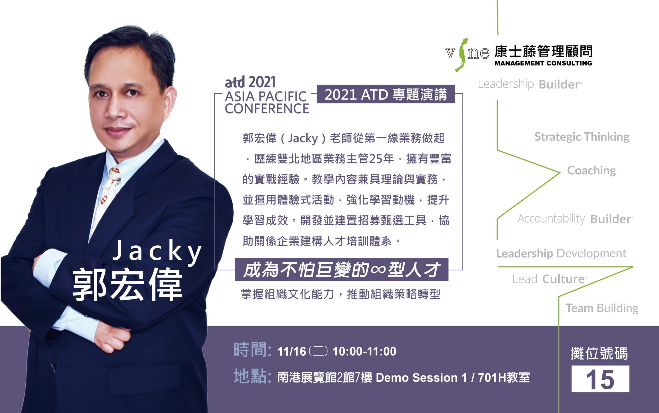 2021 ATD 講座講師 Jacky Full size 2560 × 1607 pixels 2021 ATD 講座講師 Jacky 郭宏偉(Jacky)老師從第一線業務做起,歷練雙北地區業務主管25年,擁有豐富的實戰經驗。教學內容兼具理論與實務,並擅用體驗式活動,強化學習動機,提升學習成效。開發並建置招募甄選工具,協助關係企業建構人才培訓體系。 Previous image Next image