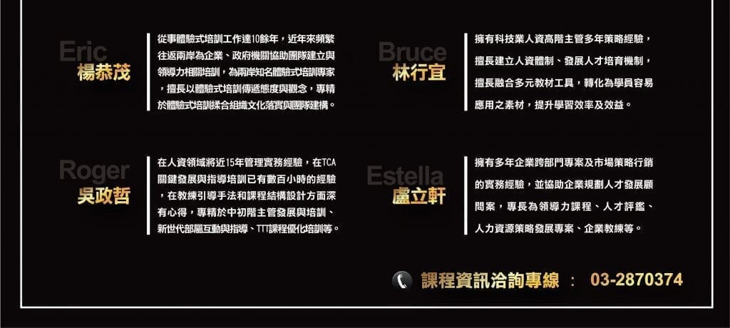 致力於人才培訓及領導企業創新,實現「人的價值」。提供專業諮詢與客製化,落實企業目標及深化核心價值。